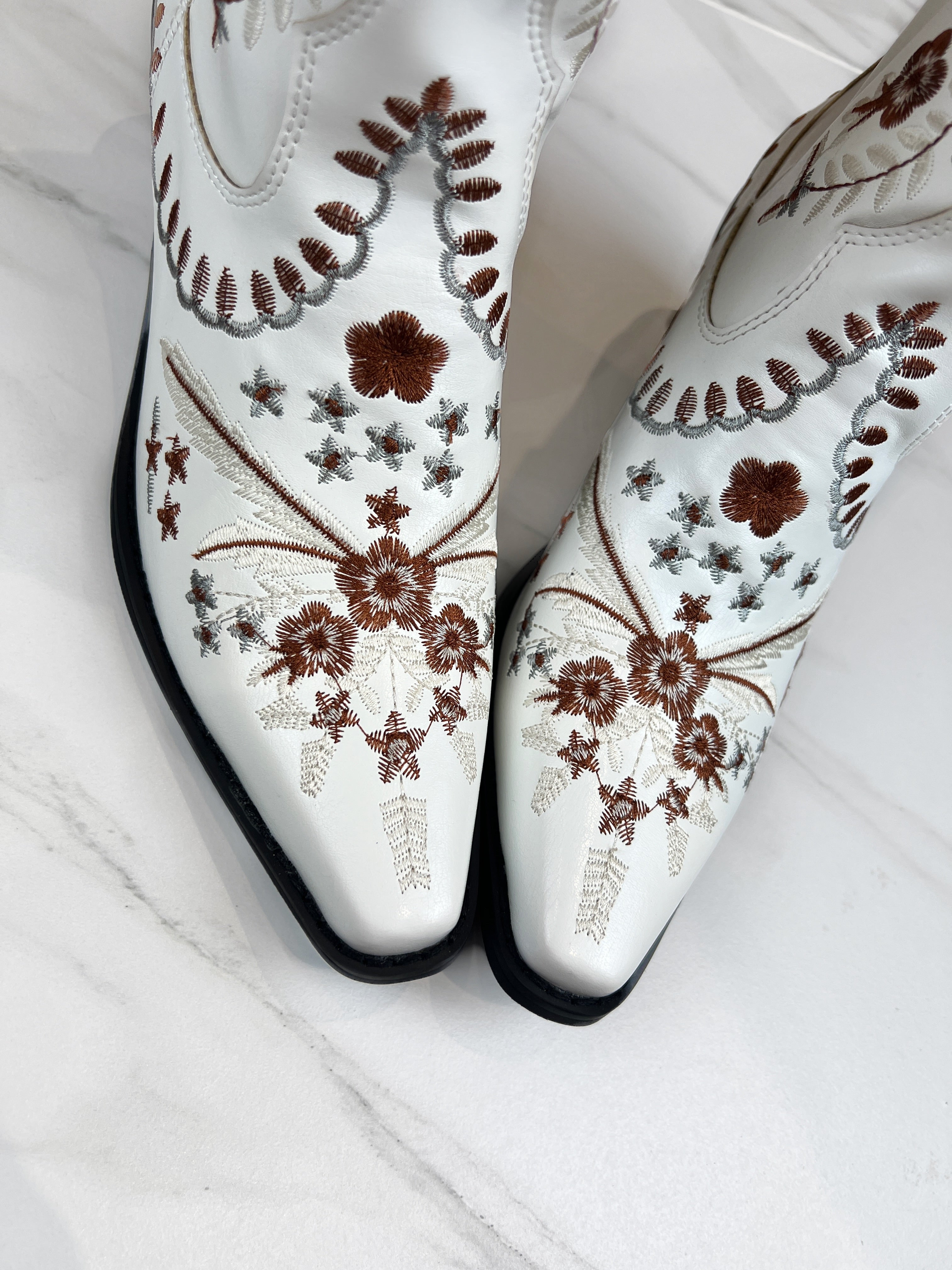 A floral boho twist on a classic cowboy boot. A top choice for weddings and the chic everyday. With a comfy low heel.