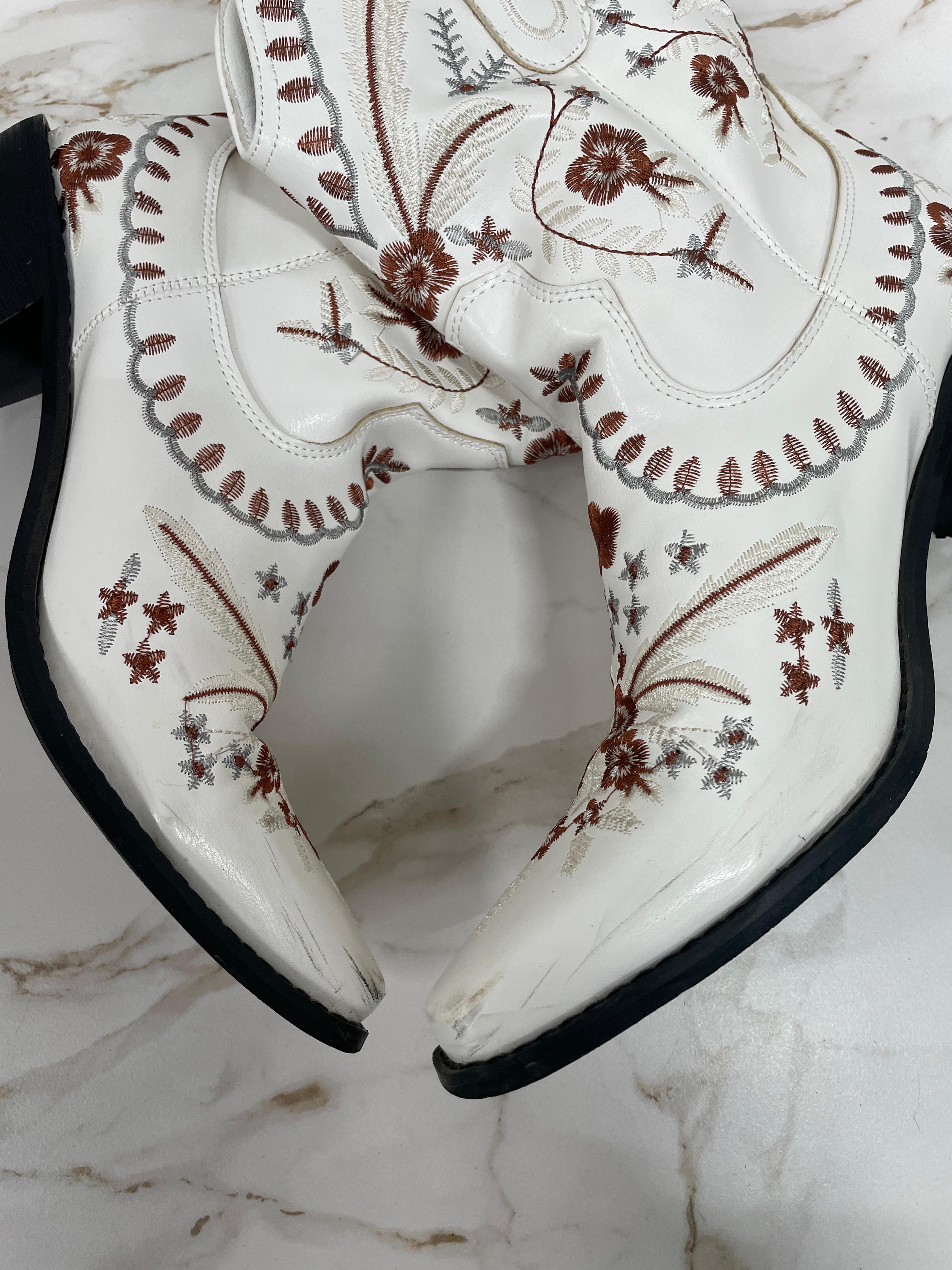 A floral boho twist on a classic cowboy boot. A top choice for weddings and the chic everyday. With a comfy low heel.