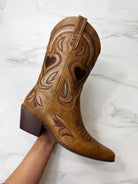 A cutesy twist on a classic cowboy boot.With a comfy low heel & heart detailing